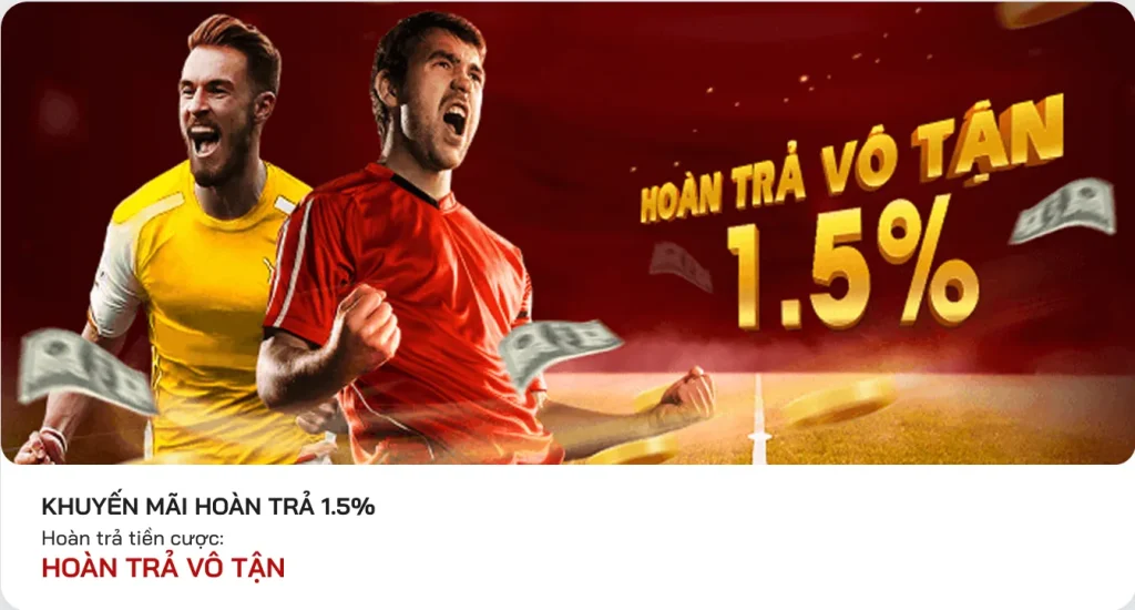 RED88 áp dụng mức hoàn trả lên đến 1.5% cho tổng số tiền cược hợp lệ trong ngày, số tiền hoàn lại không giới hạn. Điều này đồng nghĩa với việc dù thắng hay thua, người chơi vẫn nhận được một phần tiền hoàn lại. Khuyến mãi hoàn trả 1.5% chỉ áp dụng cho sản phẩm của sảnh Thể Thao, Thể Thao Ảo (trừ Volta), Slots Nổ Hũ, Đua Ngựa 3D.